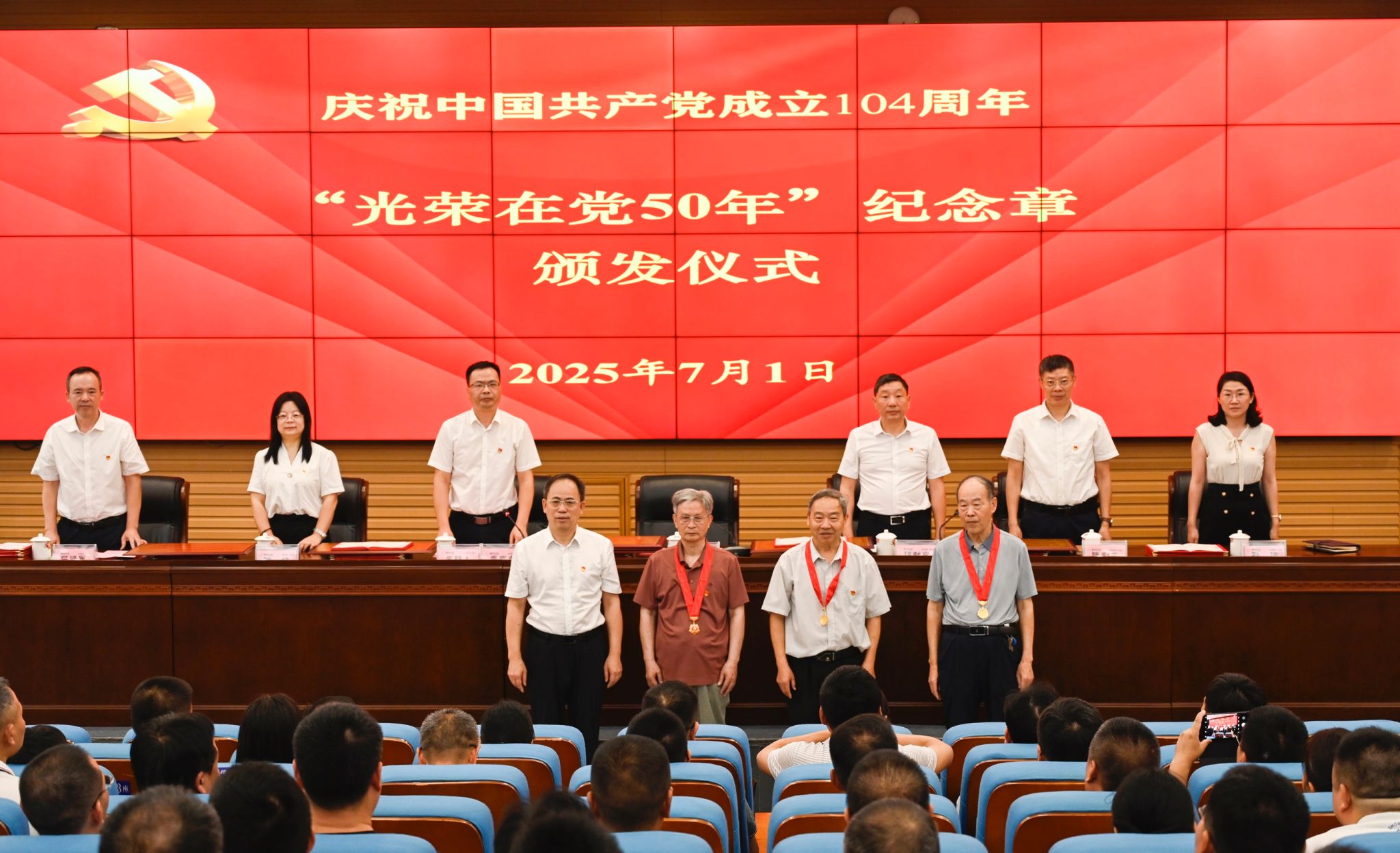 本网讯(通讯员 陈艳姣)为庆祝中国共产党成立104周年,表彰先进典型,凝聚奋进力量,7月1日上午,学校举行2025年“七一”表彰大会暨“光荣在党50年”纪念章颁发仪式,在家的校领导出席大会。会议由党委副书记袁志成主持。