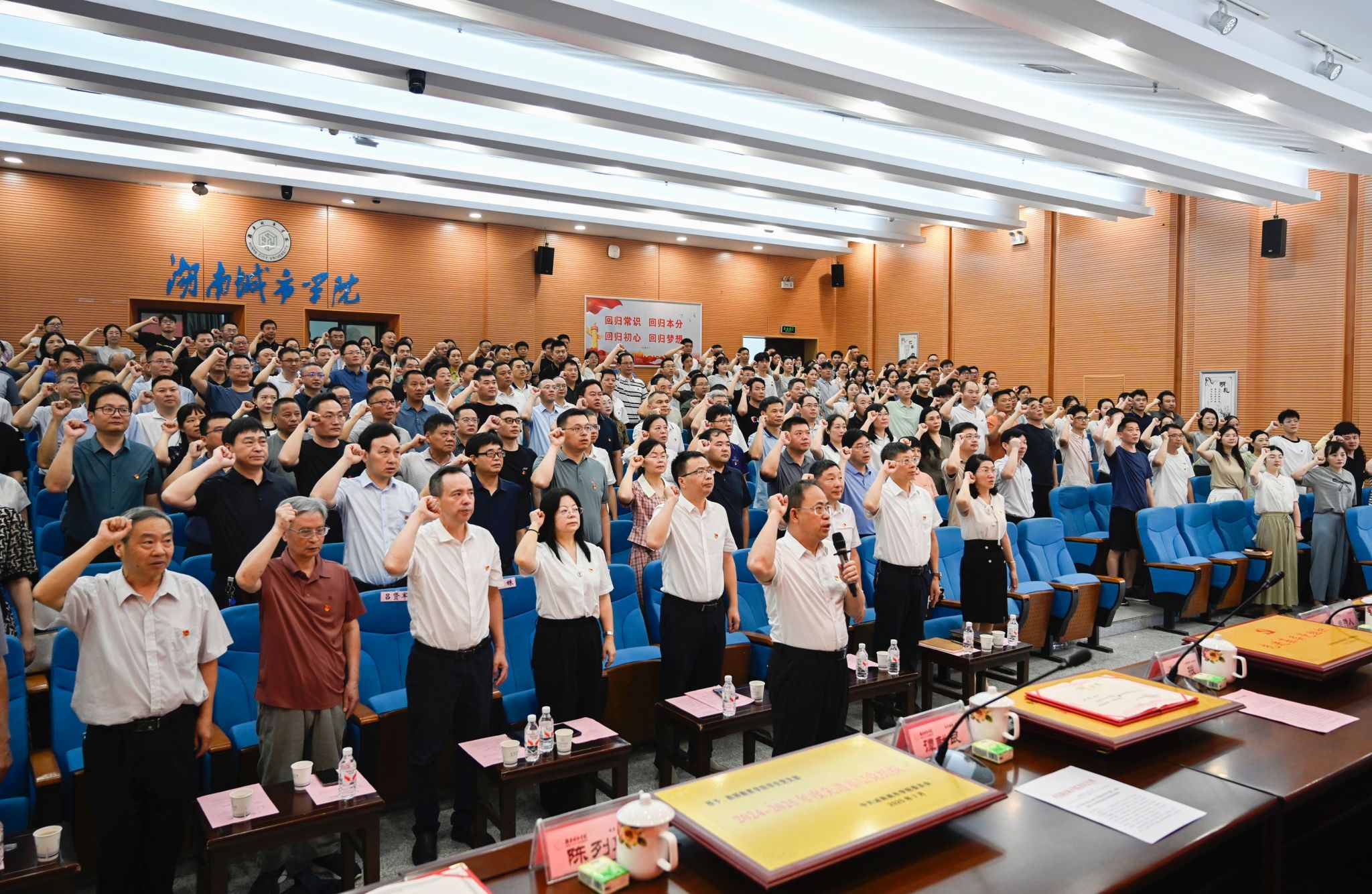 副校长谭献良宣读了“两优一先”表彰决定,对我校荣获2024年度全省教育系统先进基层党组织、优秀党务工作者和优秀共产党员,以及荣获全省高校第四批“党建工作样板支部”、党务工作示范岗、青年教工党员示范岗的集体与个人,以及对5个先进基层党组织、5位优秀党务工作者、45位优秀共产党员进行了表彰。