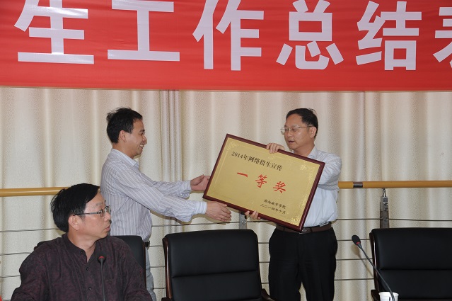 会上,招生就业处副处长郭太平作了学校2014年招生工作总结汇报,文瑞明宣读了《关于表彰米兰平台2014年网络招生宣传先进集体的决定》、《关于米兰平台2014年新生报到率奖励的决定》。
