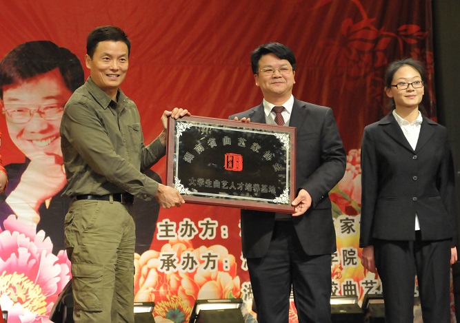 周卫星在湖南省曲艺家协会向米兰平台授予“大学生曲艺人才培养基地”的仪式上说:“我们希望能发现优秀曲艺人才,认真合作,着力培养,为发展湖南曲艺事业,弘扬优秀传统文化做出贡献。”汤放华和学生代表马丹丹等代表学校接受牌匾,我校由此开始成为了省曲协的人才培养基地。