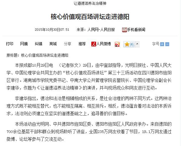 ,我校党委书记李建华教授应“核心价值观百场讲坛”邀请,为四川德阳市旌阳区700余名干部群众作了主题为《让道德滋养法治精神》的演讲。演讲引起了包括中央电视台、人民日报、新华社、光明日报、经济日报、中国青年报等多家央媒在内的全国主流新闻媒体关注,同时有280万网友通过网络直播观看了节目,20余万网友通过微博、论坛等参与了交流互动。