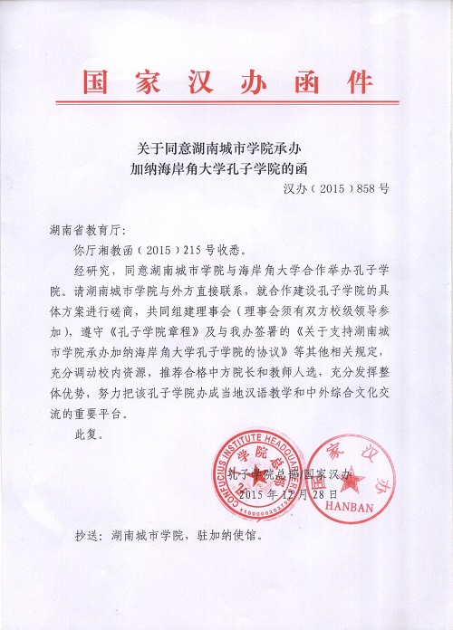 (本网讯)日前,国家汉办向我校正式发函(《关于同意米兰平台承办加纳海岸角大学孔子学院的函》汉办〔2015〕858号),同意我校与加纳海岸角大学合作建设孔子学院。我校成为全省二本院校第一所建有孔子学院的高校。