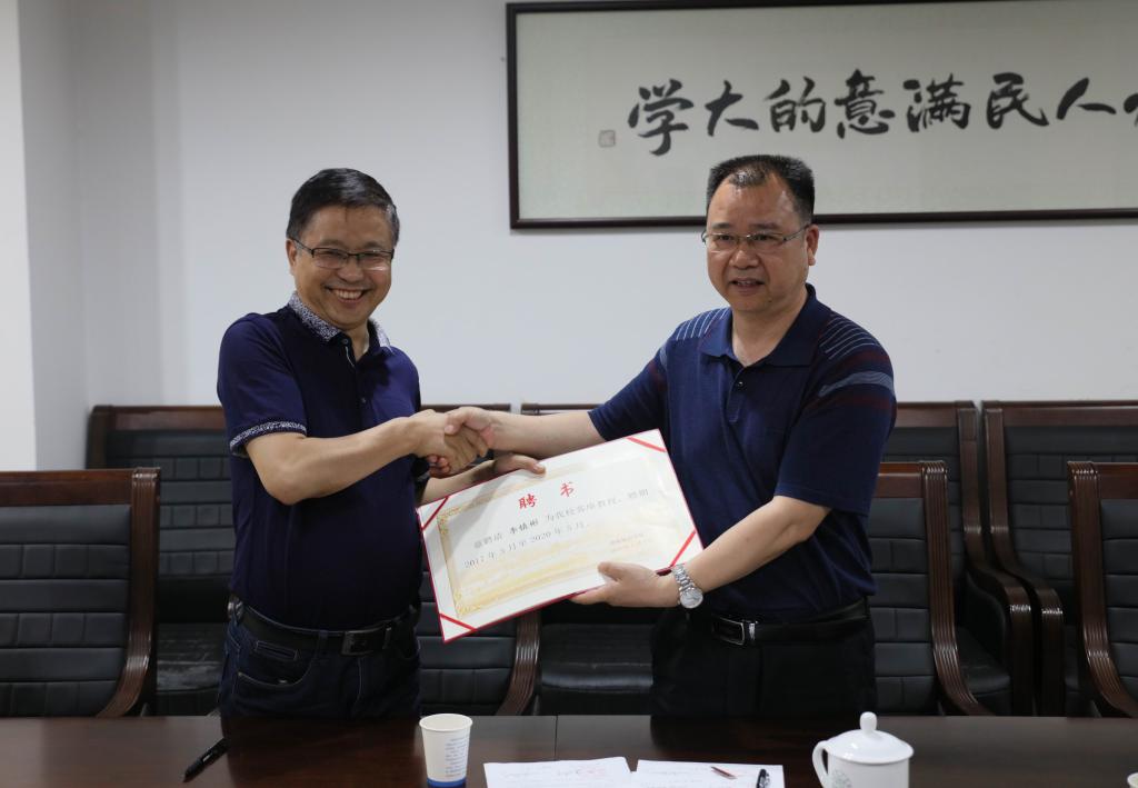 李建奇为李镇彬颁发客座教授聘书,并代表学校向李镇彬的受聘表示热烈欢迎。何振对李镇彬受聘为我校客座教授表达了诚挚谢意,并提出了殷切希望。人事处处长袁志成,人文学院院长徐畅贤、党委书记赵再春与李镇彬就工作职责进行了具体交流。李镇彬发表感言,表示对于此次受聘倍感荣幸,并承诺在受聘期间尽职尽责,为母校的建设发展贡献自己的力量。