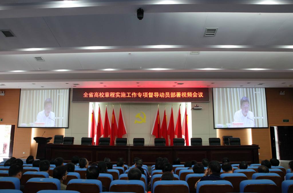 (本网讯)4月20日上午,全省高校章程实施工作专项督导动员部署视频会议在长沙召开。根据省教育厅安排,我校在图书馆报告厅设立分会场,学校党委书记罗成翼、校长李建奇和在家的其他校领导,各职能部门、二级学院党政主要负责人、法律顾问以及益阳医学高等专科学校有关负责同志等60余人参加了视频会议。