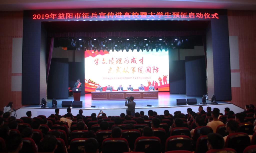 (本网讯)2019年4月19日下午,2019年益阳市征兵宣传进高校暨大学生预征启动仪式在我校音乐厅隆重举行。益阳军分区司令员席尚平,市征兵办公室主任、军分区动员处处长肖尊华,资阳区人武部部长裴庆华,赫山区人武部部长张永发,校长李建奇、副校长雷存喜以及益阳四所高校400余名师生代表参加。仪式由雷存喜主持。
