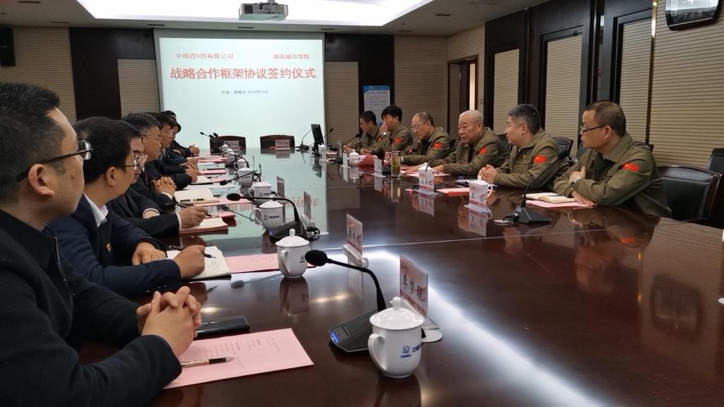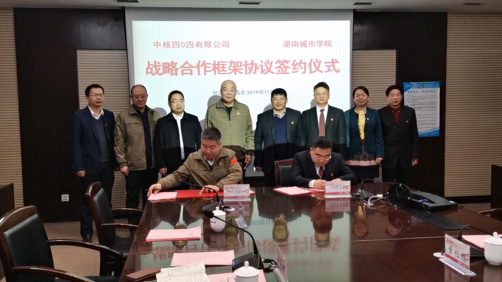 (本网讯)11月18日上午,学校与中核四〇四有限公司在嘉峪关中核大厦办公楼会议室正式签署了战略合作协议,标志双方将在人才培养、科学研究等领域开展产学研用多方合作。党委书记罗成翼、党委副书记汤放华、纪委书记姚春梅、副校长郑卫民,中核四〇四有限公司党委书记刘士鹏、副总经理宋昌钰以及双方相关部门负责人出席签约仪式。正在嘉峪关开展党性教育的湖南省高等学校121期培训班部分学员参加了签约仪式。