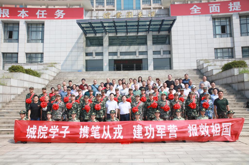 仪式结束后,校领导向入伍大学生赠送纪念品;参会领导、老师与全体入伍大学生、学生家属在图书馆前合影留念。
