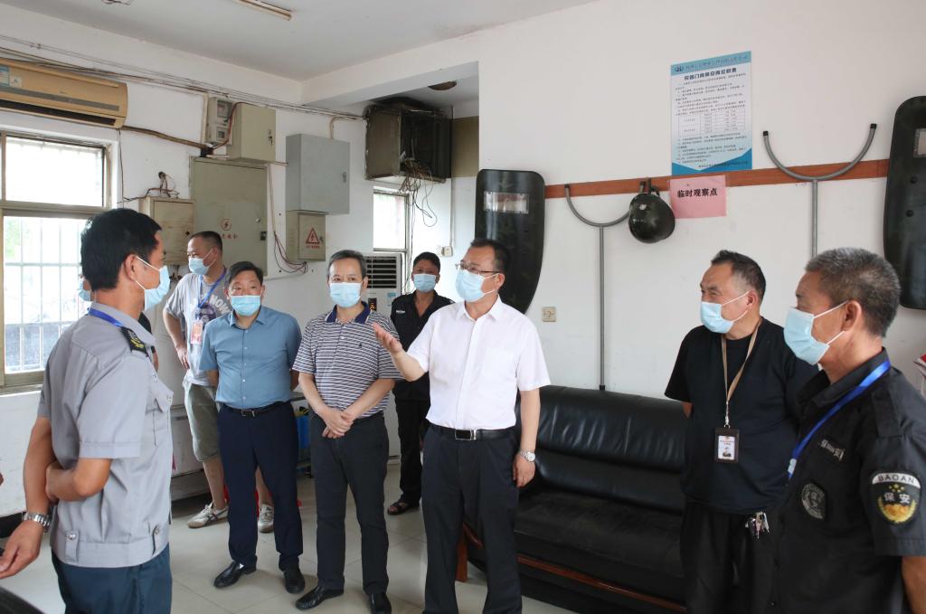 党委书记李建奇向北门值班人员了解人员出入情况。