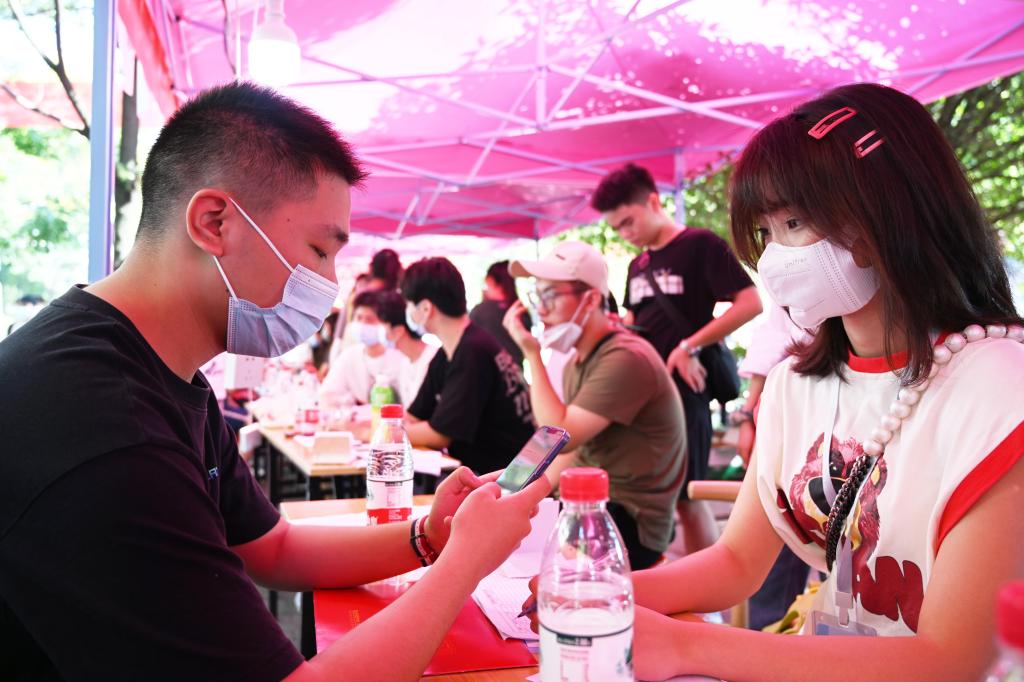 迎新点忙碌中的学生工作人员。