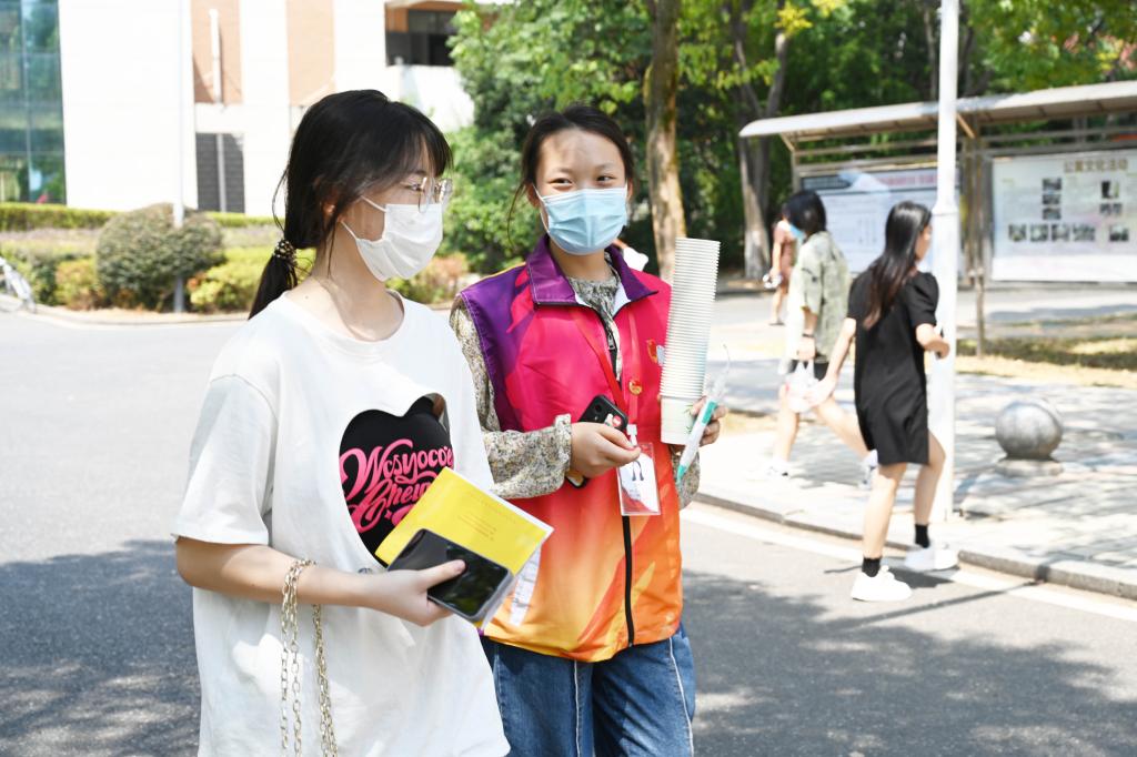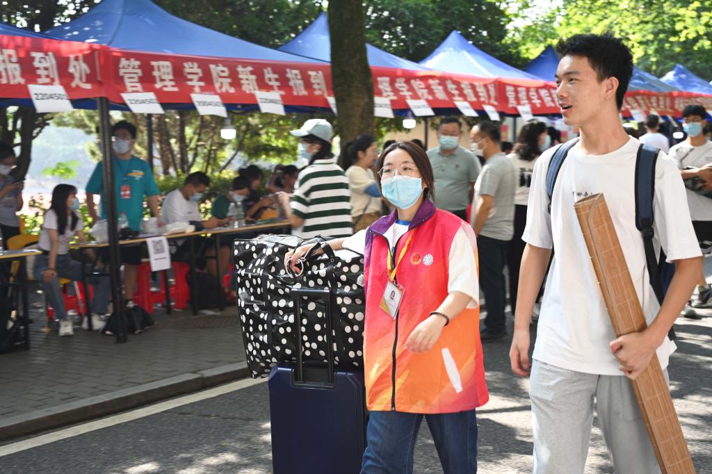 今年21岁的王梦是材化院化学工程与工艺的大四学生,也是一名迎新志愿者。上午11:00,烈日当空,但王梦仍在学校南门迎新处忙碌。顾不上擦掉额头上的汗水,她一次又一次帮助新生将行李搬上“摆渡”的电瓶车。“有一份热,发一份光。这是我第三年作为志愿者参与迎新,回想起我初入校园时,也是在学长学姐的帮助和带领下进入并熟悉校园,希望今后‘新橙子们’能够像我们一样把志愿精神传递。”王梦说。