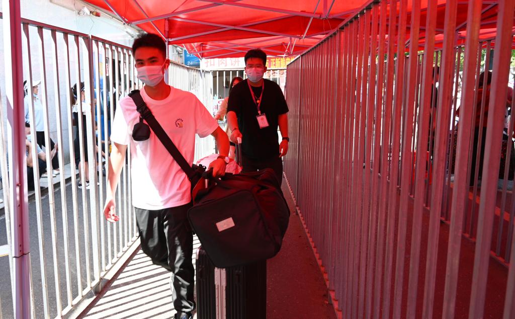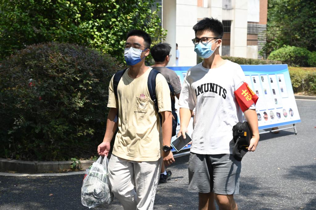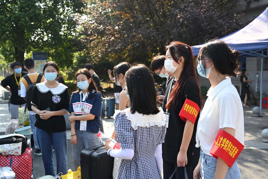 早上8点不到,学校校门口就已是人潮涌动。扫场所码、测量体温、查验健康码行程码、出示48小时内核酸检测阴性证明和录取通知书……在学校东、南、西、北四个校门处,“新橙子”们间隔1米排着长队,从临时搭建的报到通道中依次进入校园,并在志愿者的引导和帮助下前往迎新报到处。