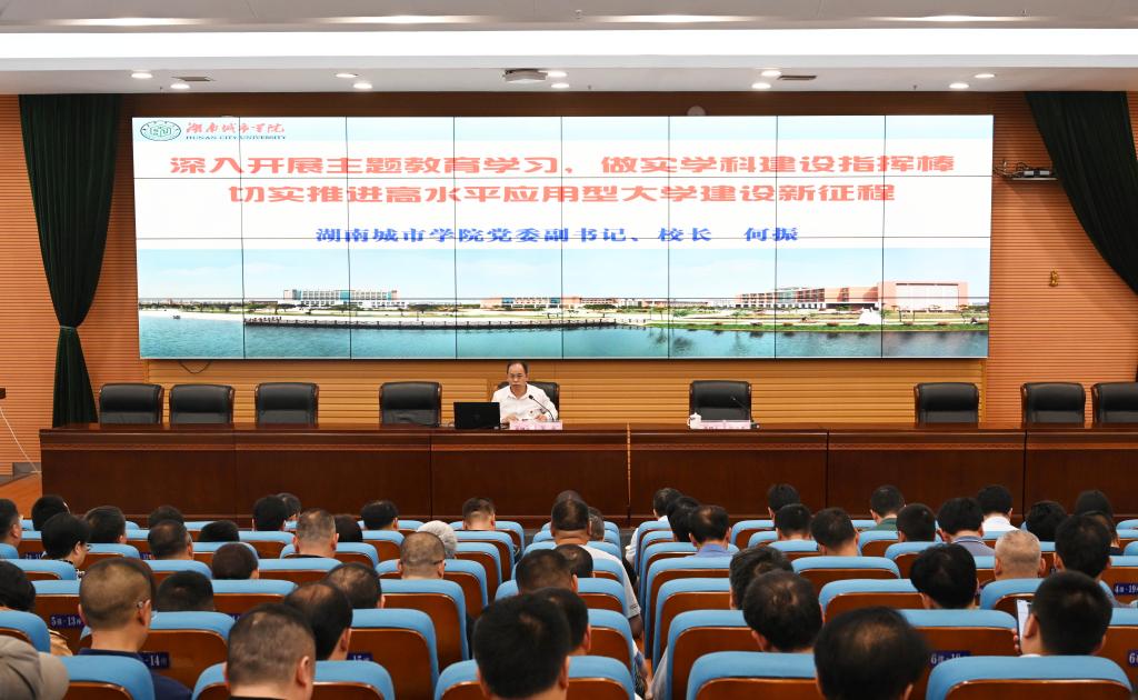 本网讯(记者 文彦波)5月4日下午,学校在图书馆报告厅举行学习贯彻习近平新时代中国特色社会主义思想主题教育读书班第三场辅导报告会。校长何振以“深入开展主题教育学习,做实学科建设指挥棒,切实推进高水平应用型大学建设新征程”为题作专题辅导报告。在家的校领导、副科级以上领导干部参加,党委委员、副校长雷存喜主持报告会。