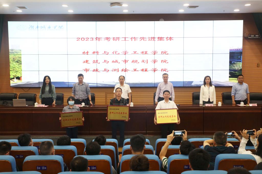 会上,陈列尊宣读了《关于表彰2023年考研工作先进单位的决定》。2023年,我校部分二级学院和班级在考研工作中表现优异,其中,材料与化学工程学院、建筑与城市规划学院、市政与测绘工程学院三个学院被授予“考研工作先进集体”称号,考研录取率分别为29.23%、23.33%、22.40%。土木工程学院、美术与设计学院/国际教育学院两个学院被授予“考研工作进步奖”称号,1908103、1902201、1908301、1908601、1801102、1801403等6个班级被授予“考研先进班级”称号。随后,出席会议的领导向获奖集体现场颁发了奖牌(状)。