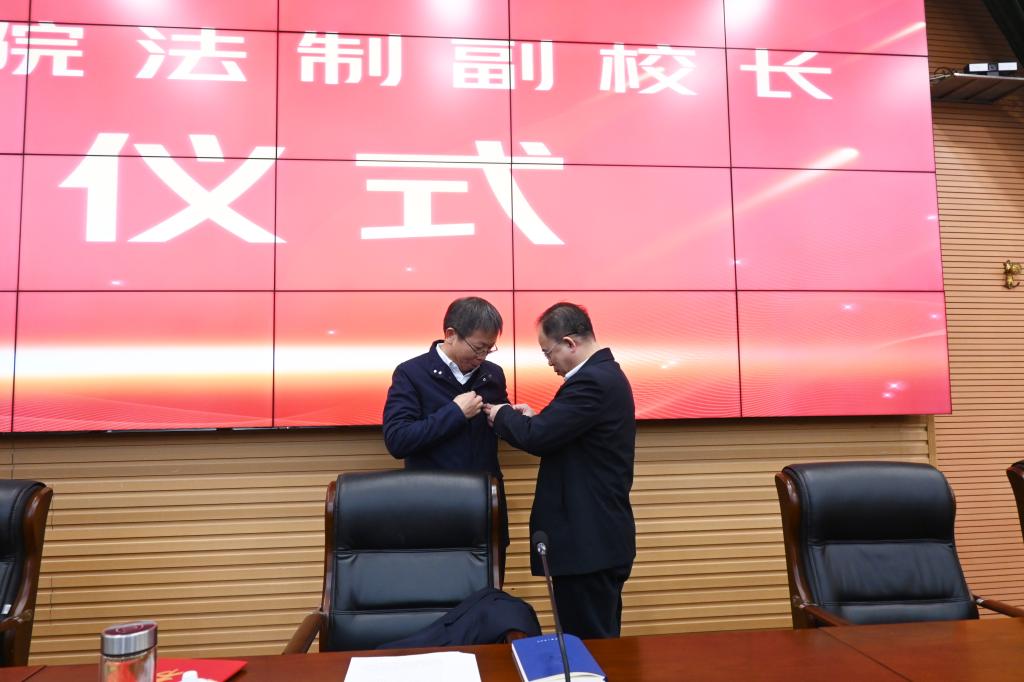 会前,学校举行了简短的授聘仪式,聘任胡安邦担任我校法治副校长。何振为其颁发聘书、佩戴校徽。
