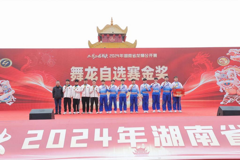 本网讯(通讯员 郭羽)天上飞龙、地上舞龙、水上龙竞,三龙齐聚,春回大地。3月9日,由湖南省龙狮运动协会等主办的“二月二 龙抬头”2024年湖南省舞龙舞狮公开赛在岳阳举行。经过激烈角逐,我校舞龙代表队不畏强敌、顽强拼搏,一举夺得舞龙自选套路金牌