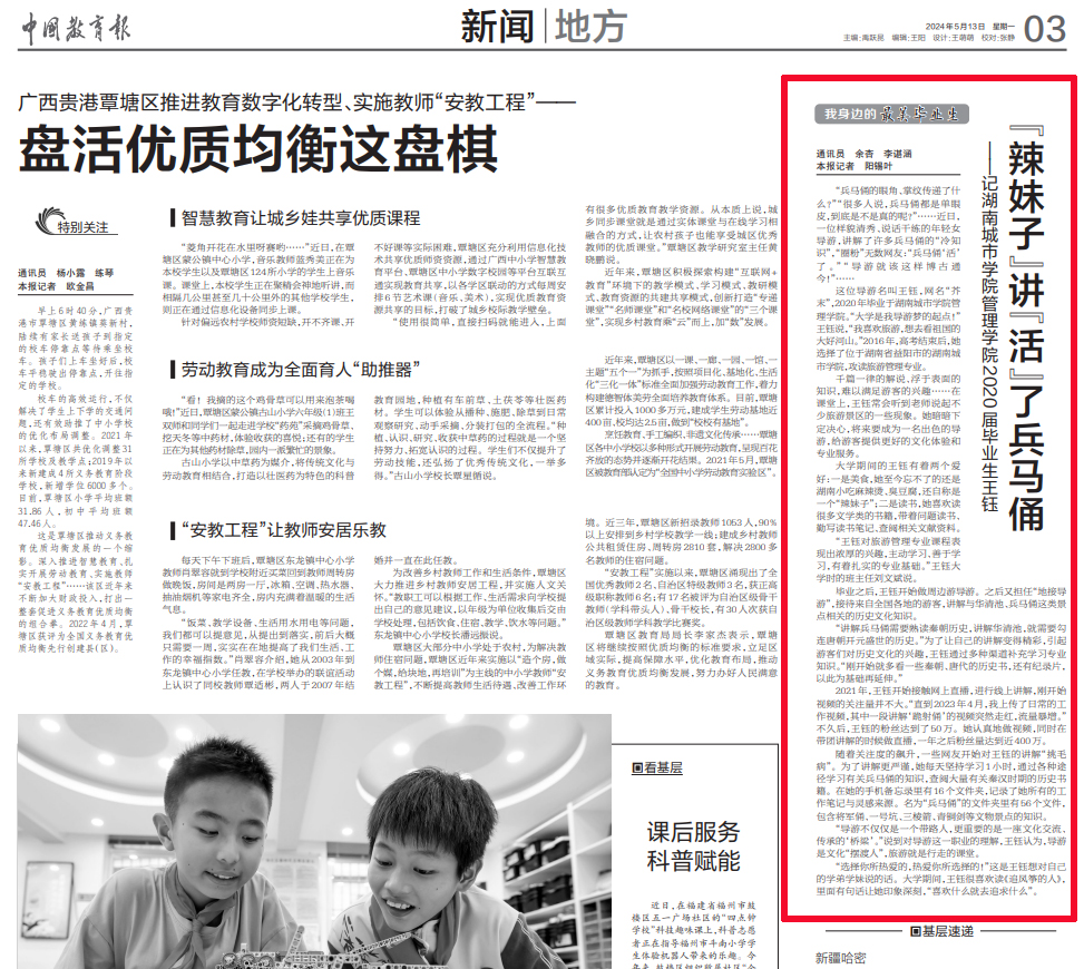 5月13日,《中国教育报》03版报道我校管理学院2020届校友王钰的青春励志故事。