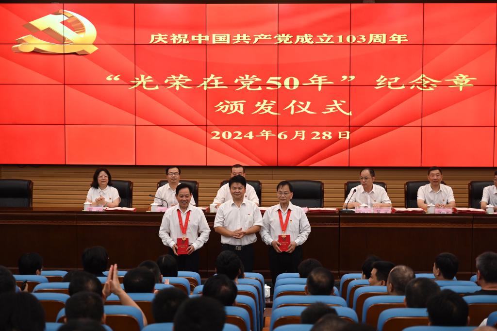 汤放华为王锡华、肖玉衡、宋冬喜、黄谷中4位老党员代表颁发了“光荣在党五十年”纪念章,向他们多年来为党和国家、学校事业发展所做的贡献致以最崇高的敬意和最诚挚的感谢。