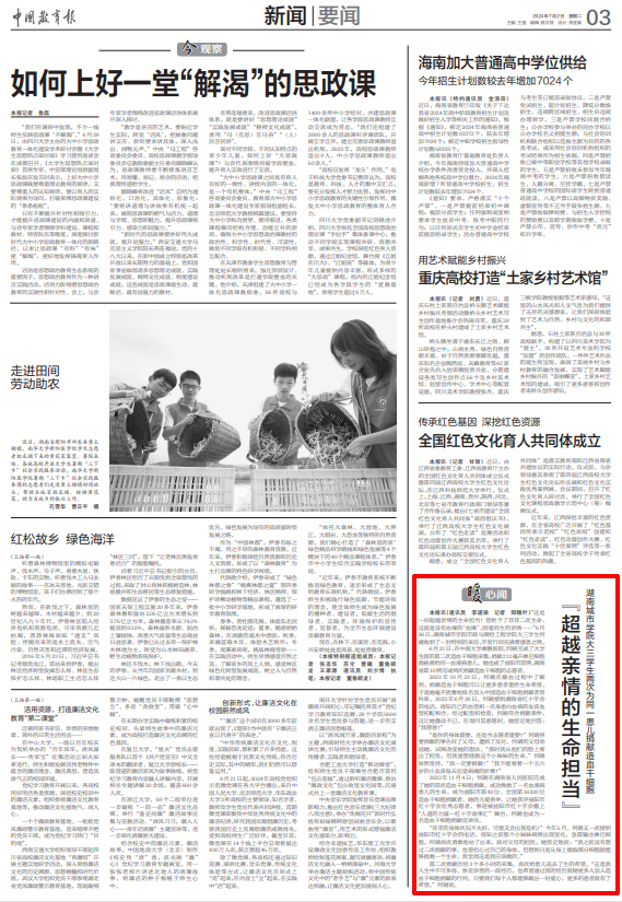 7月2日,《中国教育报》03版要闻版报道我校学生何晴两次为同一患儿捐献造血干细胞的事迹。