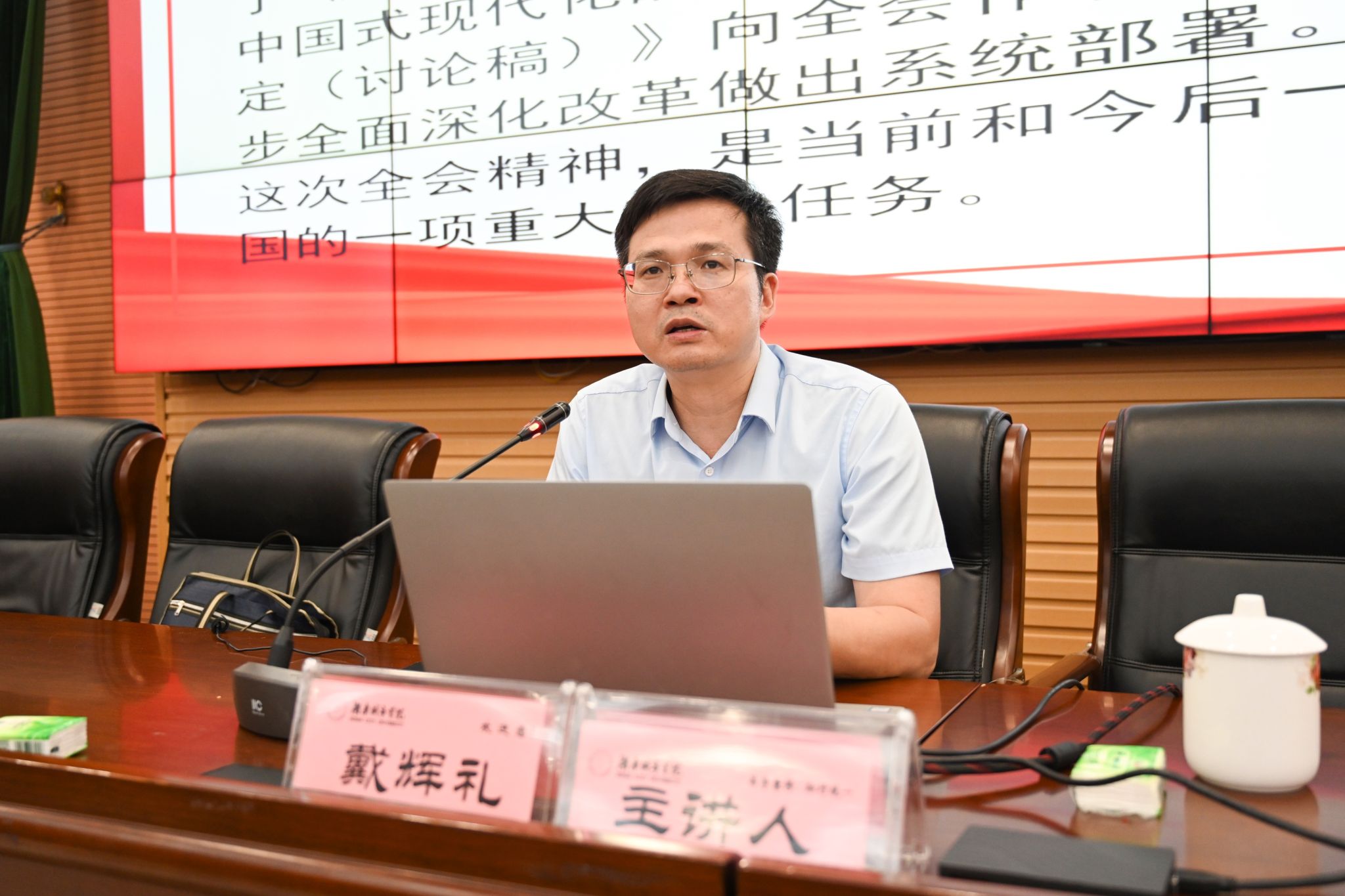 本网讯(通讯员 周文娟)9月26日下午,我校在图书馆报告厅举行学习贯彻党的二十届三中全会精神宣讲报告会暨学校党委理论学习中心组2024年第十一次(扩大)集体学习。省委宣讲团成员、省委党校科学社会主义教研部副主任戴辉礼教授做专题宣讲,会议由校党委副书记、校长何振主持。