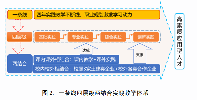 土木工程学院高度重视实践实训教学,将其视为培养学生实践能力和创新精神的重要途径,校企深度合作,突出学生工程实践能力与创新意识的培养,构建了“一条线四层级两结合” 实践教学体系(图2),成果获省级教学成果二等奖。