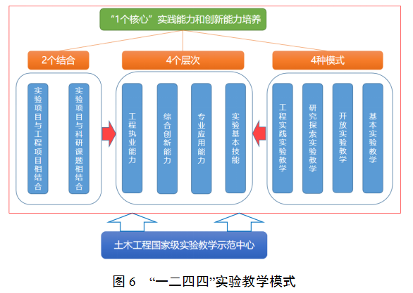 学院拥有土木工程国家级试验教学示范中心等校内实训基地,配备先进的实验设备和仪器。通过开设综合性、设计性实验课程,让学生在实践中巩固理论知识,掌握实验技能。紧密结合行业发展趋势,构建了“一二四四”实验教学模式,即“一个核心、二个结合、四种范式、四个层次”,详见图6。土木工程国家级实验教学示范中心2023年被教育部评为优秀典型案例,并在全国推广。