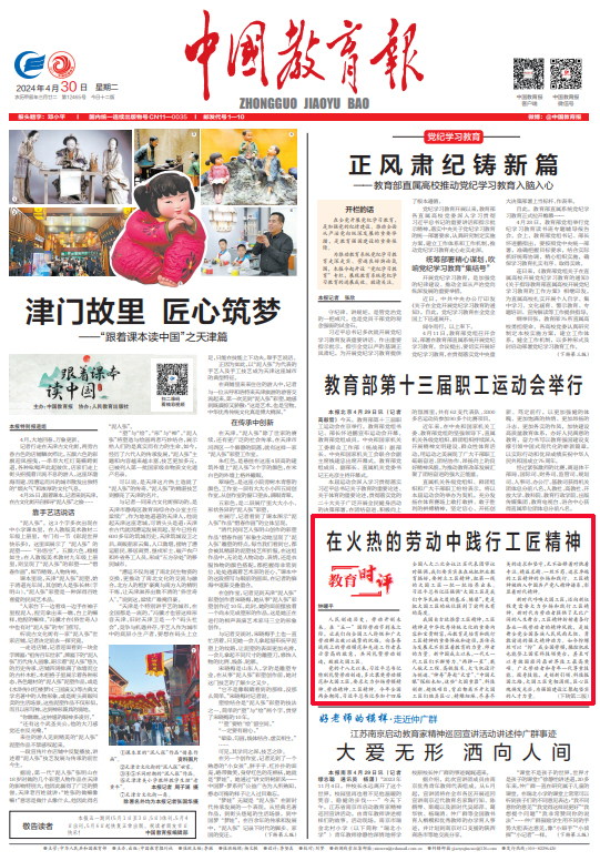 本网讯 4月30日,《中国教育报》头版发表我校党委副书记袁志成的评论员文章《在火热的劳动中践行工匠精神》。全文如下: