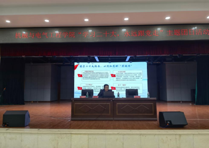 2022年11月28日晚19点我院在新食堂三楼活动中心开展“党在我心中,永远跟党走”主题团课,本次团课由机械与电气工程学院党委副书记易志明授课,我院团委学生会全体学生干部、21级和22级全体班长及团支书共同参与。